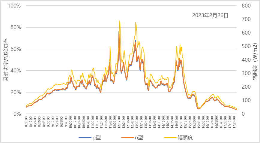 在双面发电性能方面,n型组件双面率为80%左右,p型组件双面率为70%左右,假定组件背面辐照强度100-150W/m2,那么10%双面率差异带来的n型组件发电量增益在1%-1.5%之间,当在不同的地面环境下(反射率在20%-30%时),结合不同的阵列高度、前后排间距、背面有无遮挡安装等条件, n型组件发电量增益在0.8%-1.2%之间。