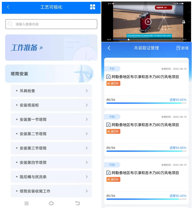 项目使用的三一重能SI-172625风电机组,叶片长度为84米(相当于210个成年人并排站在一起),叶轮整体重量约97吨(相当于20头成年亚洲象)。将如此又长又重的庞然大物吊装到90多米的高空,并在空中与主机对接已实属难事,在整个过程中实现无损安装又是如何做到的呢?通常来讲,机组吊装过程中多会出现叶片、机舱受损情况,而三一重能依托于先进的数字化、智能化技术,打造智慧吊装系统,将吊装工艺标准化、流程化、模块化、可视化,系统内可随时观看每一个吊装工艺的三维演示动画及相关资料。此外,现场人员将每个环节的关键动作实时上传到系统进行审核,实现对机组安装全过程的质量把控,使得该项目机组在整个吊装过程中无任何损伤。
