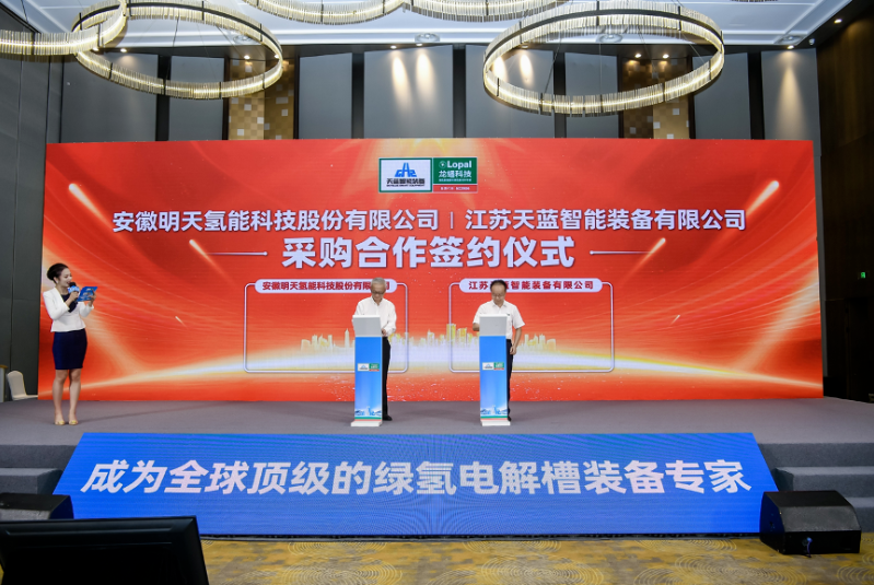 活动当天,天蓝智能装备公司与国内领先的燃料电池企业——安徽明天氢能签订了采购意向协议。明天氢能将会把天蓝智能装备公司作为后续电解槽采购的优先供方,双方将借此契机,进一步深化合作交流关系,共同推动绿氢产业向规模化、高质量方向发展。