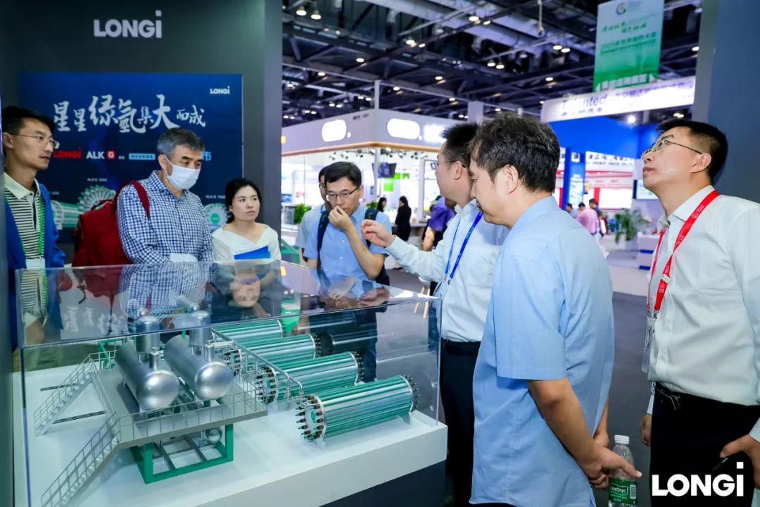 作为中国石化的战略伙伴,隆基积极参与世界地热大会装备特装展览,以技术为核心,串联起“光伏+绿氢”系统解决方案。其中,应用在中国石化首个万吨级绿氢示范项目中的4对1制氢系统解决方案模型,一经亮相即引发与会观众关注。