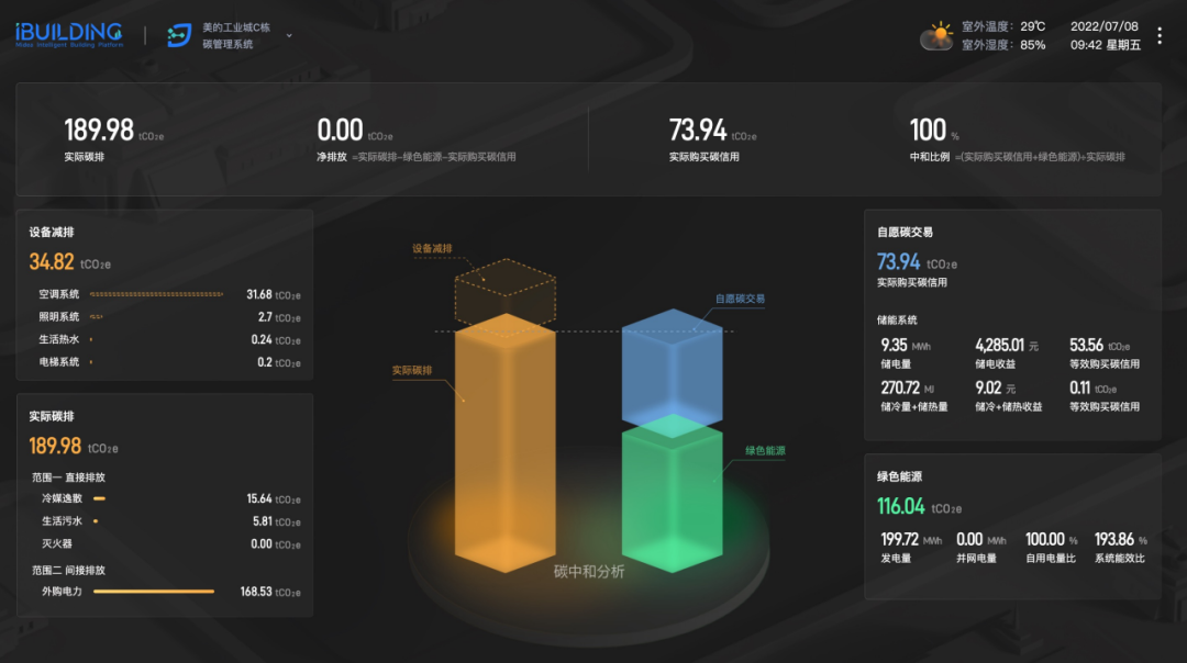 自今年1月1日至7月8日,美的工业园西区办公楼的二氧化碳排放当量为189.98吨,绿色能源抵消当量为116.04吨,启动碳交易73.94吨,已经实现了碳中和。