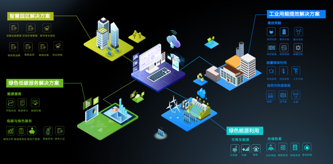 绿色低碳服务解决方案囊括了节能改造、能源审计、能源托管所组成的能源服务,以及由碳排分析、碳盘查报告、碳资产管理、零碳咨询、绿色认证所组成的低碳与绿色服务。