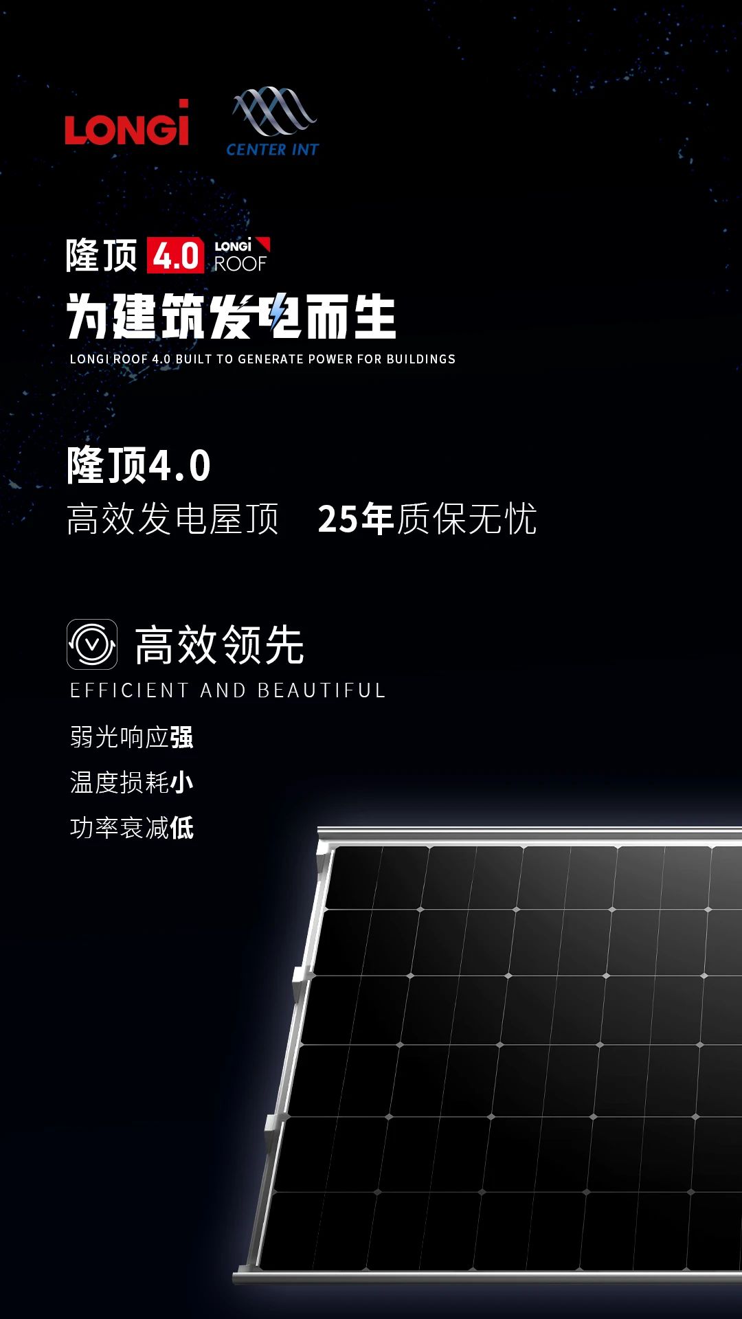 隆基和森特的联手,汇集光伏与建筑两个行业的创新力量,将以隆顶4.0作为全新开始,在高效、安全、可靠的发电效率前提下,为每一个用户带来更实在的经济效益,用实际行动拓宽更广阔的市场认可度,赋能千行百业绿色能源转型,探索更优的绿色建筑标准,开创能源建设新纪元。