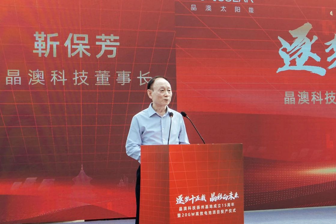 靳保芳董事长在致辞中表示,经过15年发展,扬州基地已成为全球领先的智造基地和研发中心,有力推动了扬州新能源产业的发展。今天投产的20GW高效电池项目,以绿色智能制造为引领,引进全球最先进技术、智能化设备和绿色低碳系统,积极应用绿色电力,生产n型高效产品,供应全球市场客户。