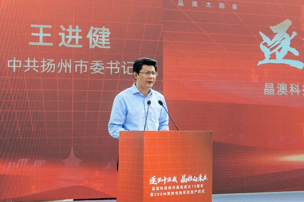 扬州市委书记王进健在致辞中对晶澳扬州项目投产表示热烈祝贺,他表示,作为今年省立项目之一的20GW晶澳高效电池项目正式投产,将为我市推进产业科创名城建设,集中心力打造重点产业集群,注入了新活力,增添了新的增长极。扬州将始终秉持好地方、事好办的服务理念,一如既往的支持晶澳在扬州发展壮大,持续优化全天候、全流程、全服务、全方位的服务理念,让晶澳在扬州投资放心,办事省心、生活顺心,共同把晶澳扬州基地打造成为晶澳最重要的智能制造中心、技术研发中心、出口结算中心。