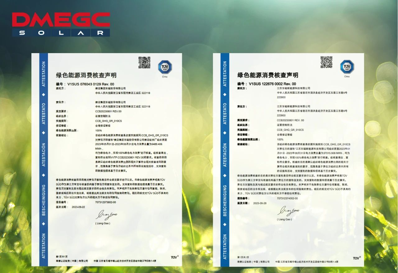 日前,国际权威检测认证机构TÜV南德意志集团(下称“TÜV南德”)向横店东磁颁发了《绿色能源消费核查声明》和《温室气体核查声明》,标志着公司在零碳工厂建设上迈出了坚实的一步。