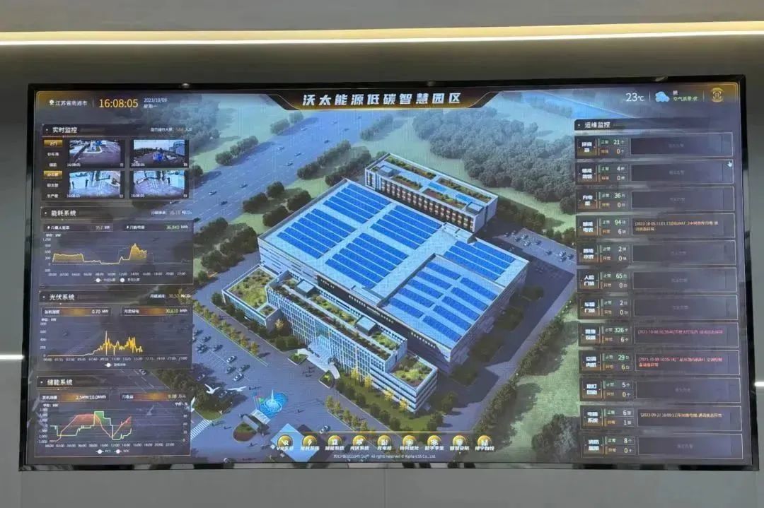 仪式结束后,到场领导及嘉宾们参观了沃太能源自主研发的数字孪生低碳智慧园区能源管理系统。该系统集成了光储充一体化、智慧安防、楼宇自控等多套管理系统,可集中运维与协同优化,多措并举推进能源精细化管控和环境的优化保护,为推动绿色发展和生态文明建设做出积极贡献。
