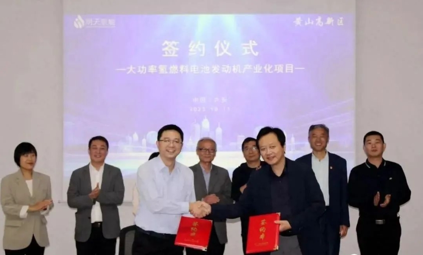 10月11日,黄山高新区党工委委员、市开投集团董事长凌沧桑率队赴六安与安徽明天氢能科技股份有限公司(以下简称“明天氢能”)举行大功率氢燃料电池发动机产业化项目签约仪式。安徽明天氢能科技股份有限公司董事长王朝云出席仪式,黄山高新区党工委委员、管委会副主任程涛与安徽明天氢能科技股份有限公司董事会秘书沈洋签订投资协议。