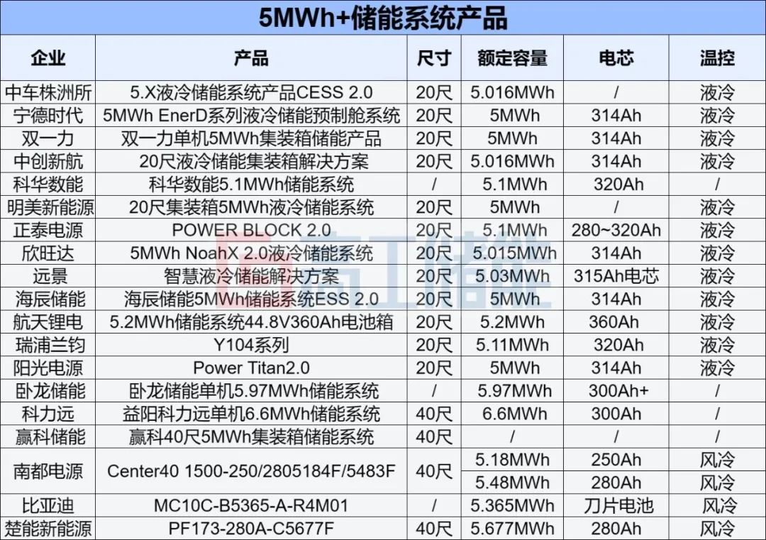 今年以来,宁德时代、中车株洲所、海辰储能、瑞浦兰钧、欣旺达纷纷发布了20尺5MWh+液冷储能系统新品。