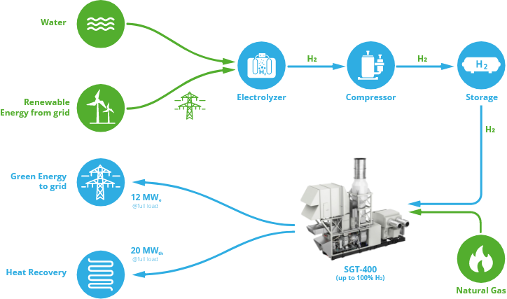 这个雄心勃勃的项目围绕着100%可再生氢的生产、储存和再电气化。这个过程从一个1MW的现场电解槽开始,在那里,水通过电力分解成氢和氧,电力主要来自风能和太阳能等可再生能源。这些氢气随后被储存在一个巨大的一吨重的储罐中,准备为西门子能源公司的SGT-400工业燃气轮机提供动力。