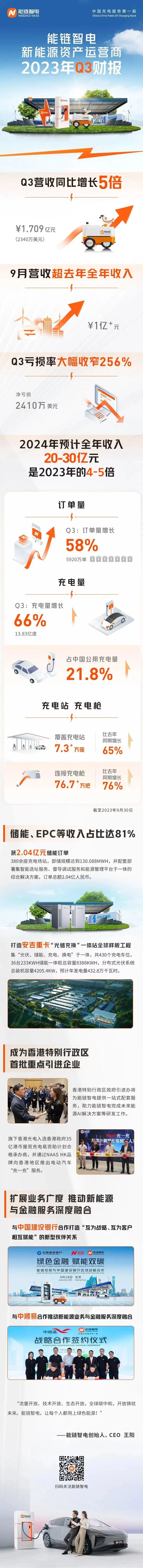 2023年Q3,能链智电订单量达5920万,同比增长58%。截至9月30日,能链智电累计覆盖充电枪超76.7万把,连接充电站超7.3万座,与去年同期相比分别增长76%和65%。9月,能链智电被纳入纳斯达克中国金龙指数(Nasdaq Golden Dragon China),是唯一一家入选的新能源充电服务公司;10月,成为香港特区政府首批重点引进企业。