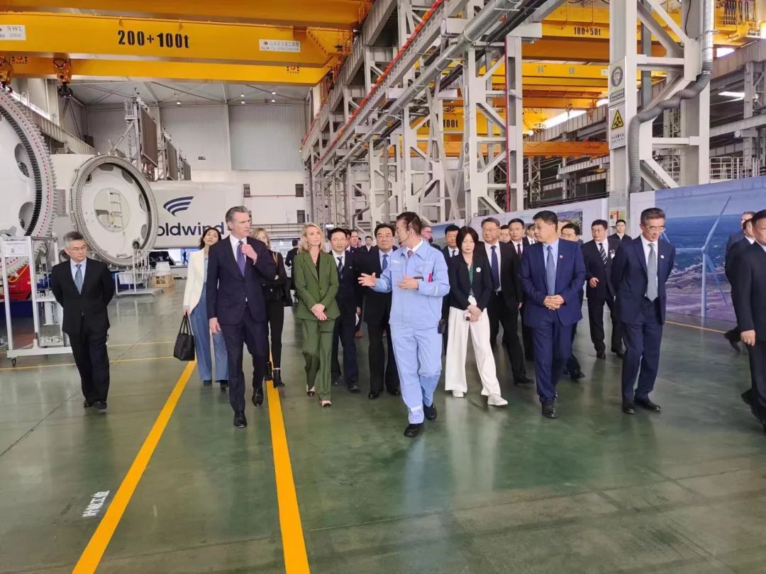活动期间,纽森一行参观了金风科技风电产品生产线、数字化控制系统等生产模块,并深入了解金风科技当前的风电发展成果与国际合作情况。纽森对全球已吊装最大容量的金风科技16MW海上机组产生了浓厚兴趣,询问该机组在不同海域的应用情况,了解其在加州海域应用的可能性。交谈中,双方还围绕海水淡化、风电制氢等展开探讨。参观完成后,纽森邀请金风科技进一步扩大在加州的业务版图,在清洁能源领域开展更深层次的互利合作。