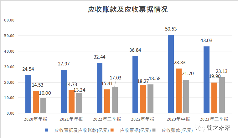 4、2023年因销售订单增加应收款项出现上涨,其中第三季度应收账款与应收票据总金额相比上半年有所下降:其中主要为应收票据金额的下降,应收账款第三季度有小幅增加。