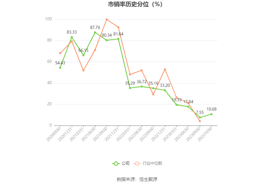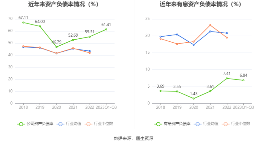 在偿债能力方面,公司2023年三季度末资产负债率为61.41%,相比上年末上升6.10个百分点;有息资产负债率为6.84%,相比上年末下降0.57个百分点。