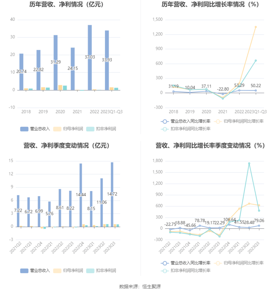 根据三季报,公司第三季度实现营业总收入14.72亿元,同比增长79.06%,环比增长33.10%;归母净利润5930.73万元,同比增长622.08%,环比持平;扣非净利润5470.19万元,同比增长479.07%,环比下降8.32%。