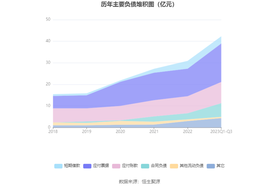 负债重大变化方面,截至2023年三季度末,公司应付票据较上年末增加39.46%,占公司总资产比重上升3.01个百分点;合同负债较上年末增加123.64%,占公司总资产比重上升4.14个百分点;应付账款较上年末增加24.64%,占公司总资产比重上升0.17个百分点;长期借款较上年末增加184.15%,占公司总资产比重上升1.06个百分点。