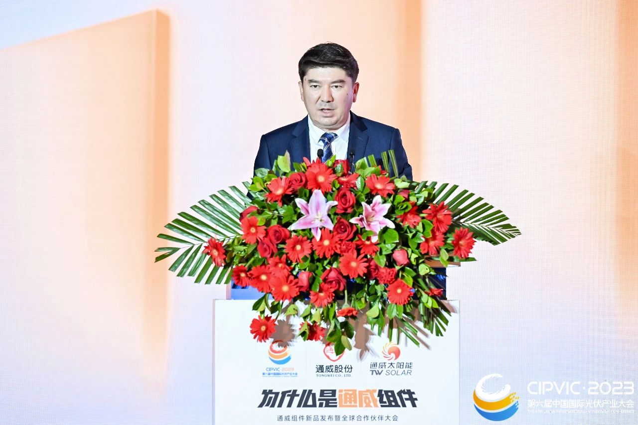 通威股份光伏商务部组件全球营销总经理邱新在致辞中首先对莅临现场的领导嘉宾致以衷心的感谢,并表示,今年是通威入局组件的第一个自然年,这一年的发展离不开广大伙伴的支持,也离不开这个沉淀定力的时代。时代为何选择通威?选择通威就是选择高效、选择诚信和选择可靠。高效、诚信、可靠架起了合作交流的桥梁,也为共同建设绿色能源的未来、共同奔赴更美好的生活的提供了更多的选择路径。真诚期待与广大行业同仁继续携手同行,共谋合作新篇,共绘兴业愿景。
