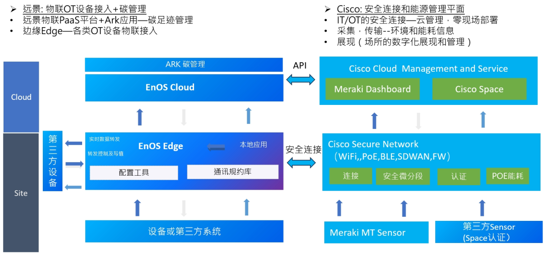 思科可以帮助 IT 将网络转变为能源管理控制平面,优化能源消耗、降低成本、减少碳足迹,并监控整个组织的能源使用和能源网络。例如,思科 Meraki 是基于云管理的全栈式有线、无线、安全、传感器和视频监控解决方案,可以为远景 EnOS 系统和用户 IoT 设备提供符合企业安全标准的通信基础,同时,思科 Meraki,Space,DNAC 等平台的可持续发展特性和开放 API,可以与 EnOS 互通,帮助企业实现全面精细化的碳排查和碳管理,并通过网络系统和环境监测的见解加强可持续发展的创新和双向业务设计。