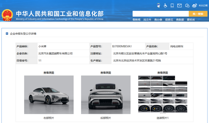 公示信息显示,名单中有两款小米牌纯电动轿车,型号分别为BJ7000MBEVA1、BJ7000MBEVR2,企业名称为北京汽车集团越野车有限公司。这也意味着,北汽越野车公司成为小米汽车的代工方,作为北京汽车集团有限公司全资子公司,北汽越野车公司的实际控制人为北京市国资委。