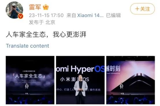 在工信部文件披露不久,雷军还发布了一条应景微博“人车家全生态,我心更澎湃。”