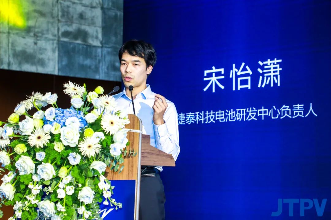 发布会现场,在与会嘉宾的共同见证下,《捷泰科技新一代N型TOPCon产品白皮书》正式发布。捷泰科技电池研发中心负责人宋怡潇从行业发展趋势、未来技术展望以及捷泰品牌三个层面对白皮书进行了深入解读。