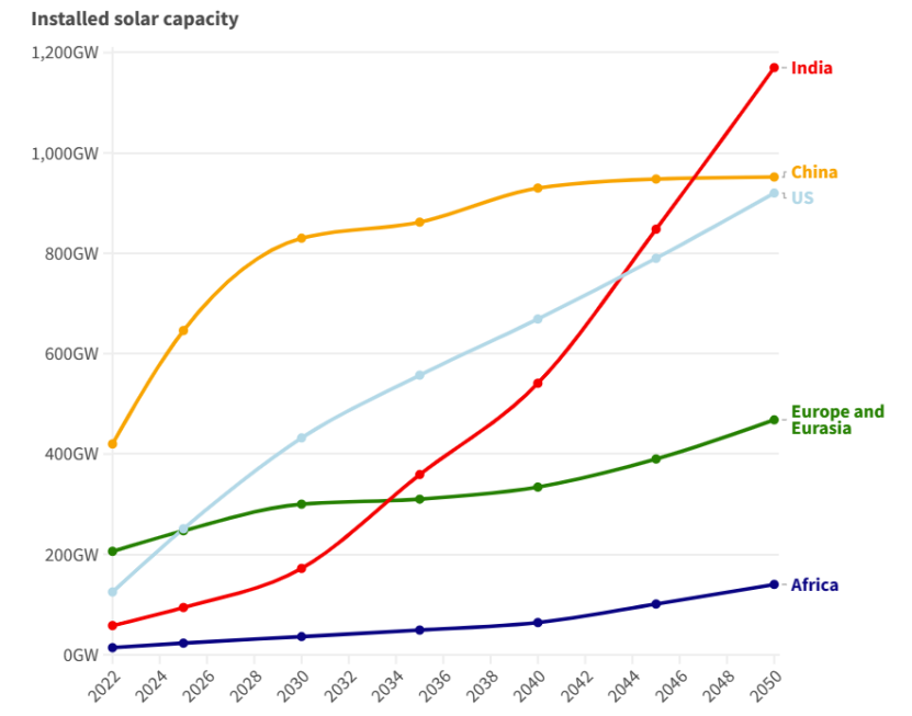 近年来,印度光伏市场发展迅速,光伏装机始终保强劲增长。截至2023年6月30日,印度可再生能源发电的累计装机容量达到129.6GW,太阳能约占可再生能源总装机容量的54%。美国能源信息署(IEA) 《国际能源展望》报告预测称,至2050年,印度的太阳能装机容量将在全球占据主导地位。