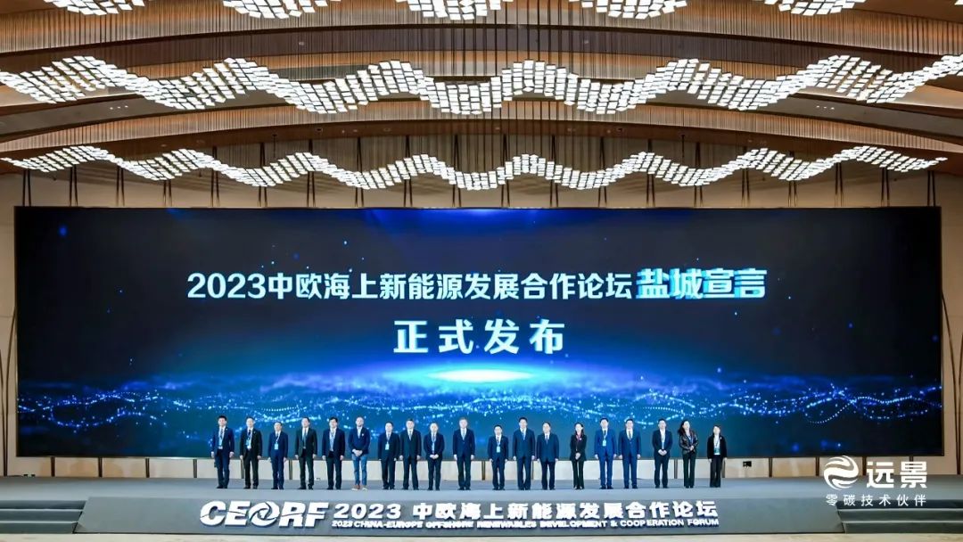 论坛同期发布了《2023中欧海上新能源发展合作论坛盐城宣言》等重要成果,田庆军代表远景上台发布宣言。