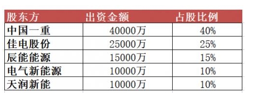 公司股权结构:中国一重占股40%、出资40,000万元,佳电股份占股25%、出资25,000万元,辰能能源占股15%、出资15,000万元,电气新能源占股10%、出资10,000万元,天润新能占股10%、出资10,000万元。