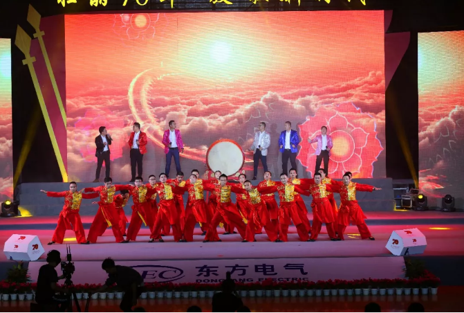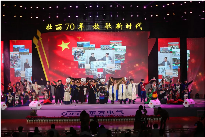 由东方电机的歌舞表演《我与祖国共成长》,东方自控的歌舞表演《龙的传人》,昭觉人民带来了热情的歌舞《新情深意长》,东方汽轮机的歌舞《天下乡亲》,壤塘县的舞蹈《则曲博姆(壤塘美 东方情)》等节目演绎了东方电气礼赞新中国,伴随祖国共同迈入改革开放富起来、民族复兴强起来的伟大历史进程。同时,由昭觉县和壤塘县同胞带来的精彩歌舞既呈现了民族服饰的华美,也展现了东方电气积极响应习近平总书记和党中央坚决打赢脱贫攻坚战的伟大决定,与定点帮扶地区人民结下的深厚情谊,鱼水深情引起现场观众的强烈共鸣,奏响了展演的金色乐章。