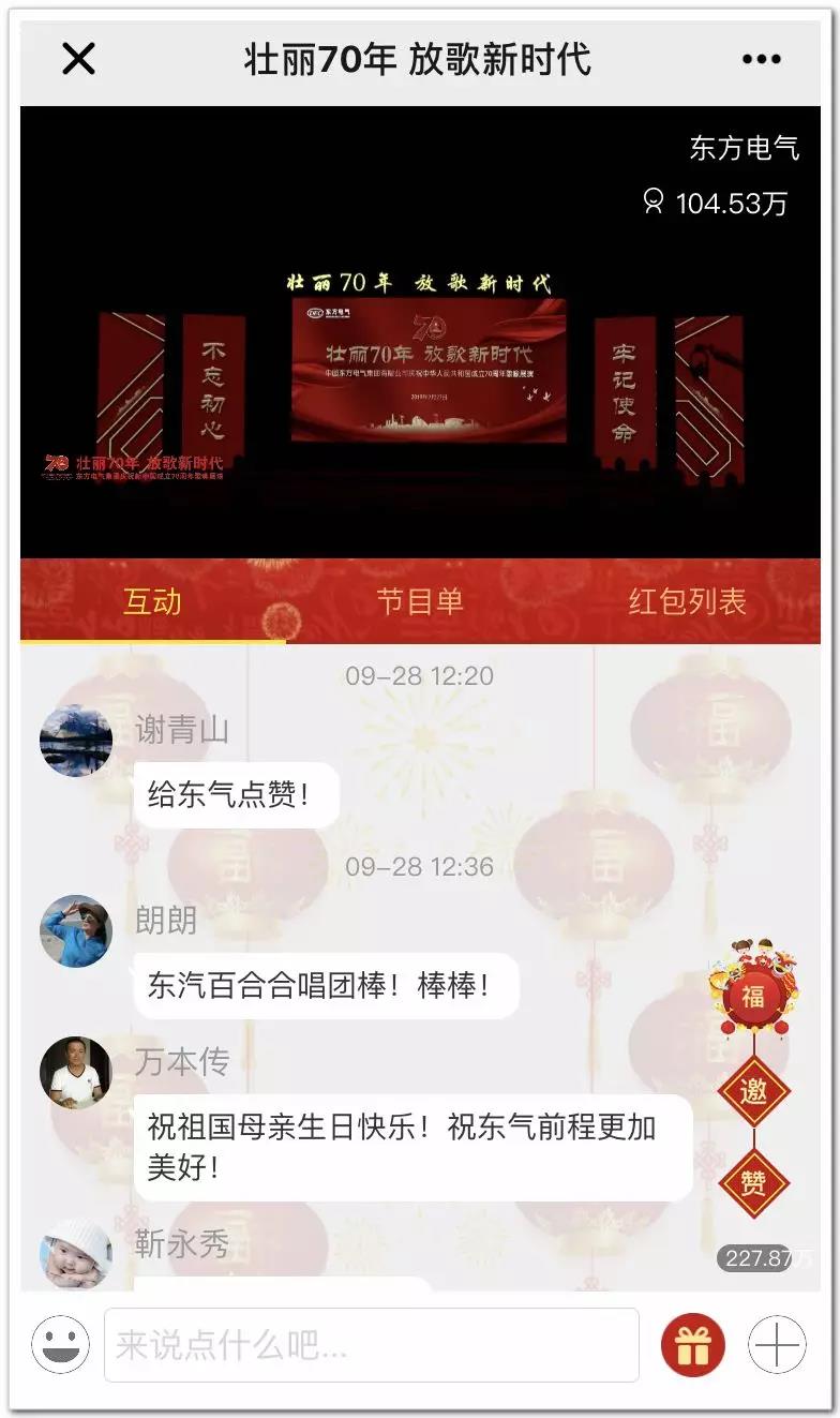 通过网络直播,东方电气集团干部职工及家属,无论是在家还是出差在外,都能通过手机、电脑的方式收看晚会直播,参与到晚会互动。据统计,27日晚全球共计80余万人在线收看晚会,截止本条微信推送时,已有超过100万人观看晚会精彩表演。