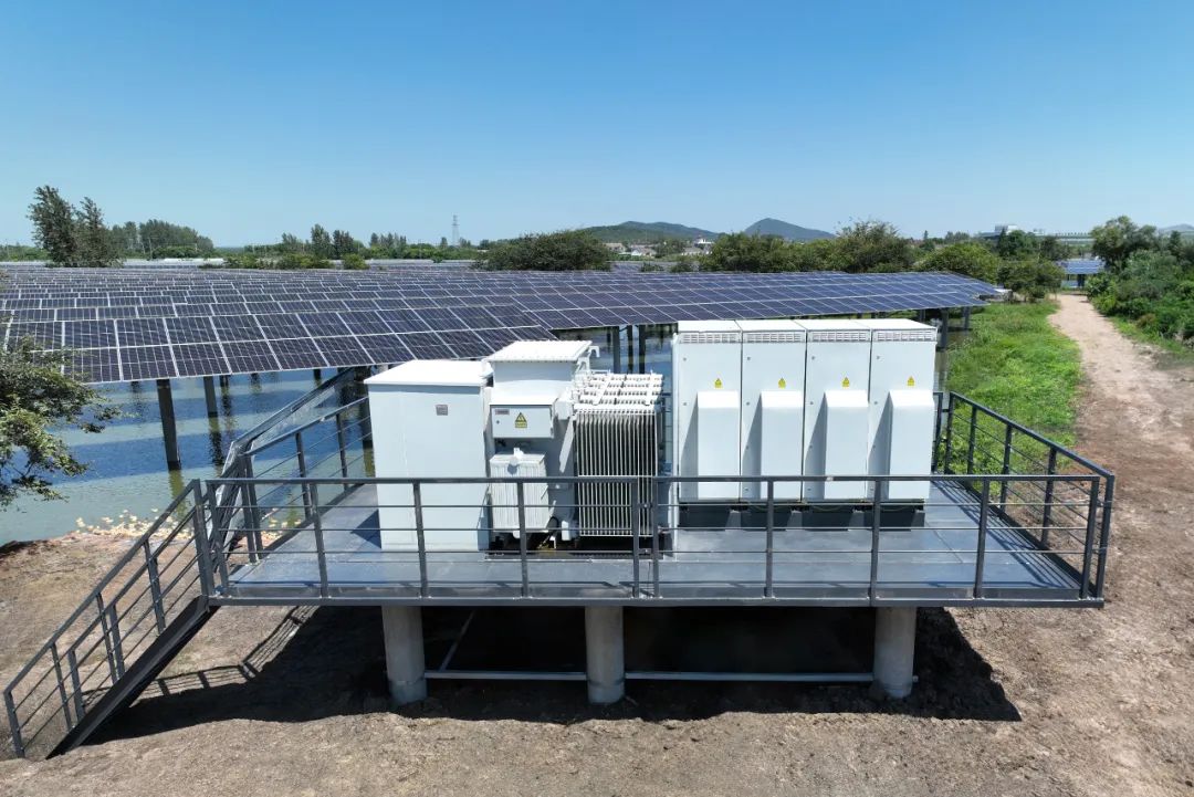 15天的活,1天干完!最近,行业内一款名为“一体式平台”的创新神器引起了小编注意:这款神器由阳光电源首创,与阳光“1+X”模块化逆变器一起构成了“一体式平台解决方案”,将逆变器、箱变、设备平台、油槽等一体化创新设计,出厂前预安装,平台与设备“合体”进场,一步平放于现场桩基上,当天吊装、当天完工,让项目大幅提速。位于安徽和县的300MW渔光互补电站率先见证了这一神器。