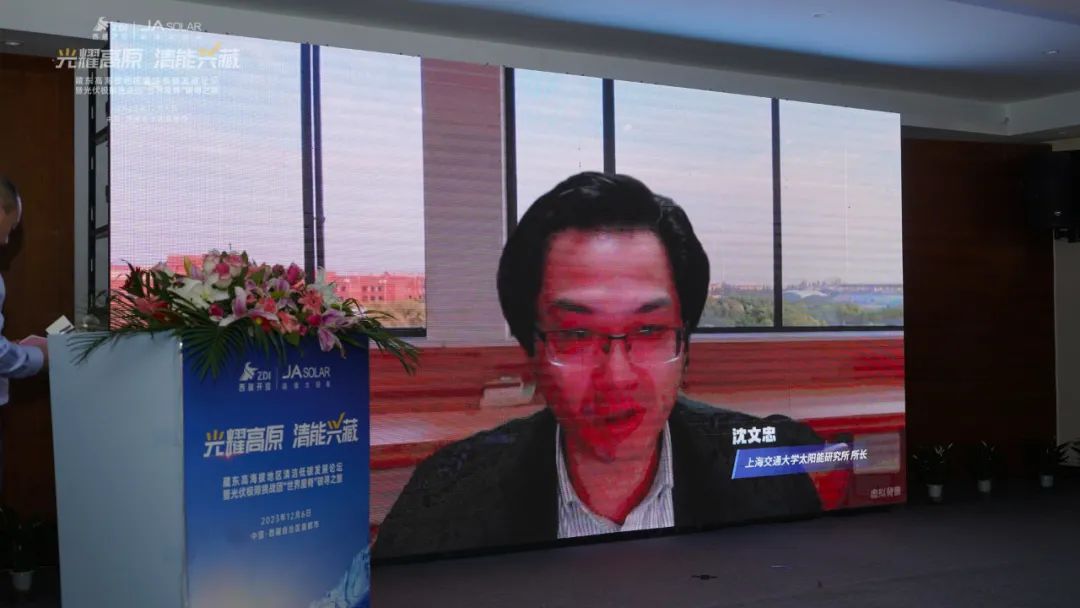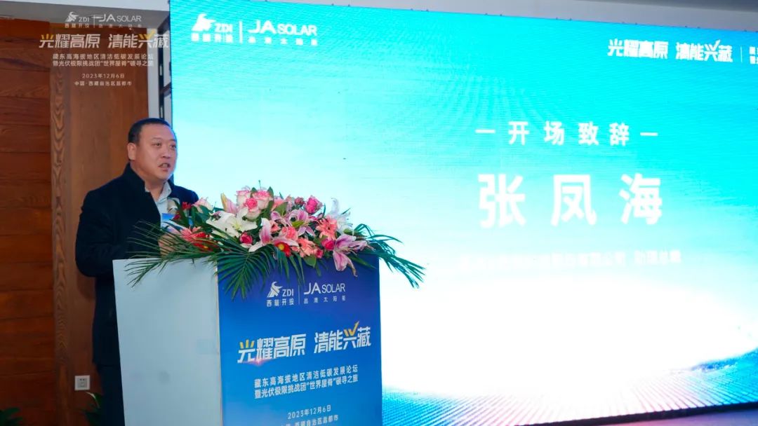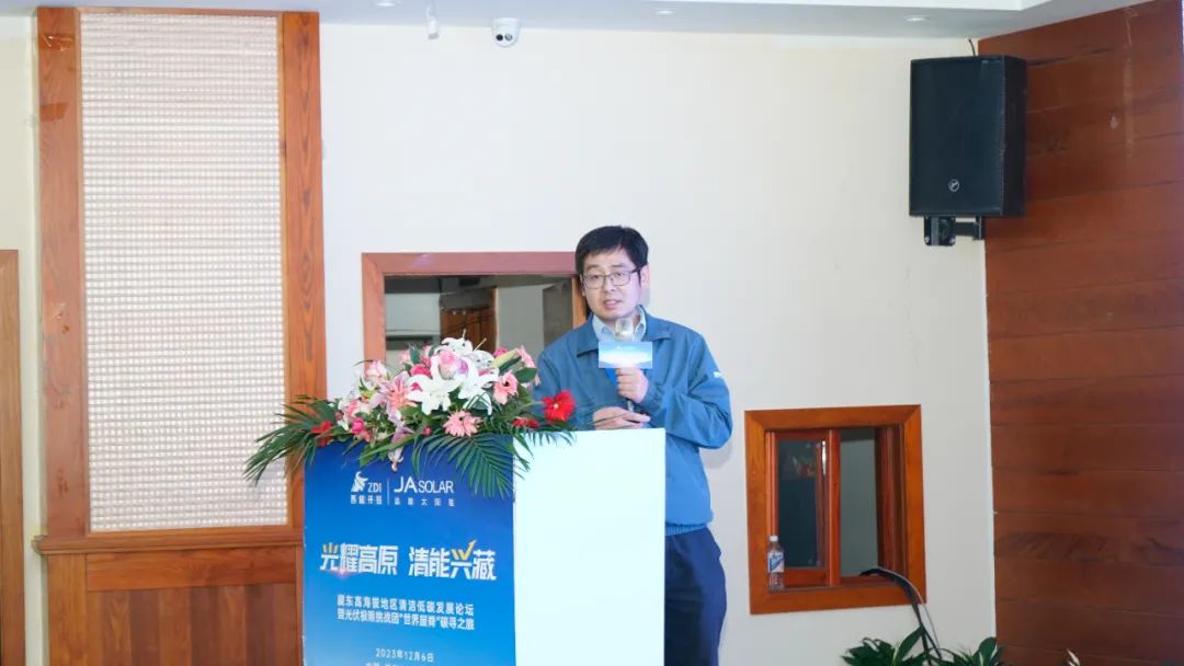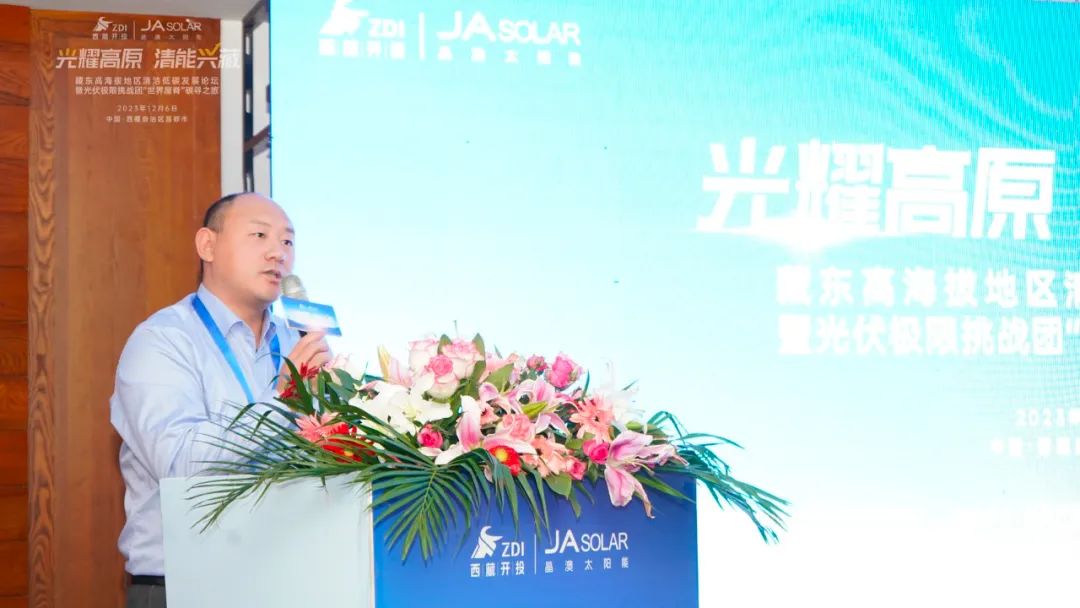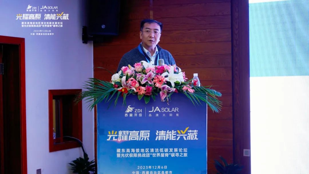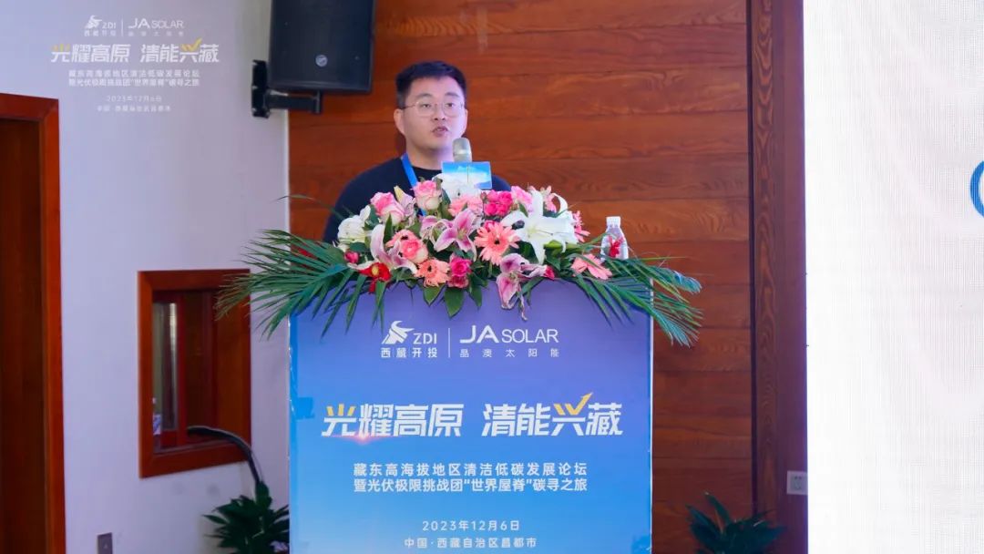 晶澳科技助理总裁张凤海也为大会进行了精彩致辞。他介绍,克服超高海拔、高寒缺氧、群山高耸等恶劣的自然条件,于上个月刚刚并网的昌都市察雅县吉塘200MW+160MWh储能牧光互补复合型光伏项目,采用晶澳科技新一代n型DeepBlue 4.0 Pro组件,产品具备更低衰减、更优高温发电性能、更高双面增益及更好弱光性能,并通过了包括高寒、高紫外、低空气密度、冰雪载荷等系列严苛环境下的可靠性能测试,能够完美适应高海拔地区的环境与气候条件,为电站高效安全稳定地运行提供了有力保障。