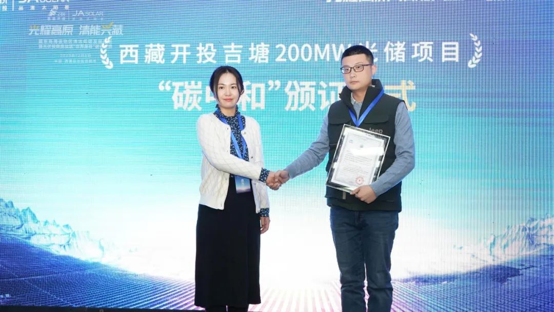 论坛上,CTC国检光伏检验认证院副院长李娜,为西藏开投吉塘200MW光储项目颁发“碳中和”证书,现场由西藏开投吉雅光伏能源有限公司总经理徐凡上台领证。