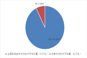 就资源储量来看,甘肃省新能源可开发量整体位居全国前列,主要集中在河西地区,开发条件较好。根据中国气象局2020年资源评估成果,全国风能技术开发量99亿kW,其中甘肃省5.6亿kW,占比5.66%,全国排名第4,随着低风速风机普及利用,风资源开发量还将进一步提升;全国光伏发电技术开发量1287亿kW,其中甘肃省95亿kW,占比7.38%,全国排名第5,开发利用空间巨大。详见图2和图3。