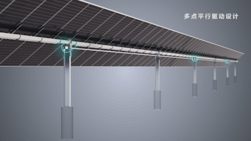 在搭载多点平行驱动系统后,跟踪支架单套系统驱动装置由一变多,大风来临时可实现多点自锁,大风天气适应度高,整体系统在任意角度稳定性均比单点驱动高系统扭转刚性强,因此在各个角度都具备更大的临界风速,可实现200%风稳定性;