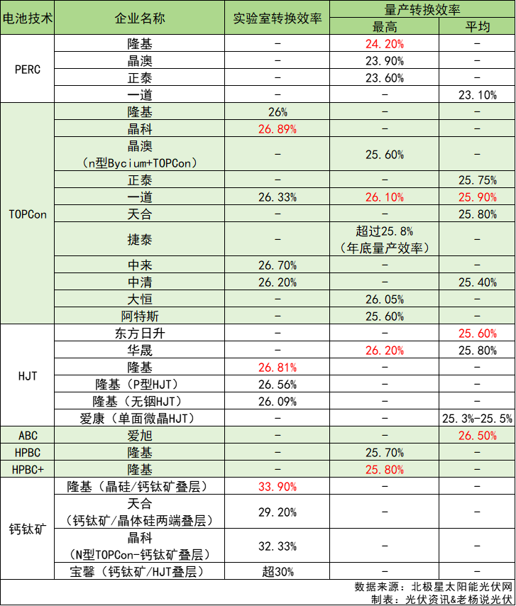 这是一张部分企业光伏电池效率一览图。从P型向N型过渡的技术路线,逐渐成为行业共识。而N型电池又细分为TOPCon、HJT和BC三大技术路线。从目前的状态来看,实验室转换效率最高的是商业化“遥遥无期”的隆基(晶硅/钙钛矿叠层电池),为33.9%。量产最高转换效率最高的是华晟HJT,为26.2%,量产平均转换效率最高的是爱旭的ABC电池,为26.5%。