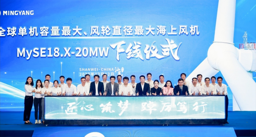 12月12日,明阳智能MySE18.X-20MW海上风电机组下线仪式在明阳智能汕尾海上高端装备制造基地隆重举行。该机组是目前全球已下线单机容量最大、风轮直径最大的海上机组,其成功下线是我国海上风电发展的又一里程碑,是明阳作为海上风电行业领导者积极推动海上风电平价上网、布局深远海发展的重要举措,代表我国已具备超大型海上风电机组及其关键部件自主研发和制造能力。