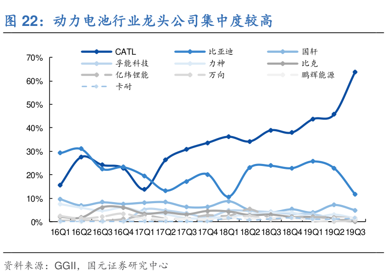 此后动力电池行业集中度与日俱增。到2019年,前十家动力电池的装机量集中度占比高达87.9%,较2018年前十名企业的装机量又增长了5%。