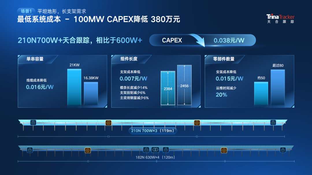 平坦地形之下,全新升级的开拓者1P与 700W+组件匹配还可以实现系统成本的显著降低。经测算,相比N型630W组件, 使用全新升级的开拓者1P与700W+组件,可成功降低线缆成本0.016元/W,支架成本0.007元/W, 安装成本0.015元/W,运维费用降低10%,最终实现项目总体资本支出降低0.038元/W。