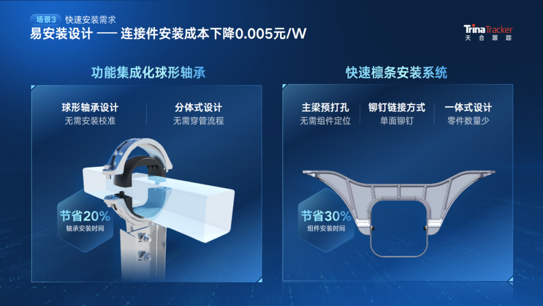 天合跟踪采用的快速安装解决方案可在复杂安装环境下降低安装成本,提高施工效率。全新开拓者1P使用缩管设计,可节省50%主梁连接时间;无机械传动的多点驱动系统,可减少30%零部件,减少30%的驱动安装时间;上下分体球轴承,无需安装校准,无需穿管流程,可节省20%的轴承安装时间;快速檩条安装系统,相比传统檩条设计,可减少30%的组件安装时间。