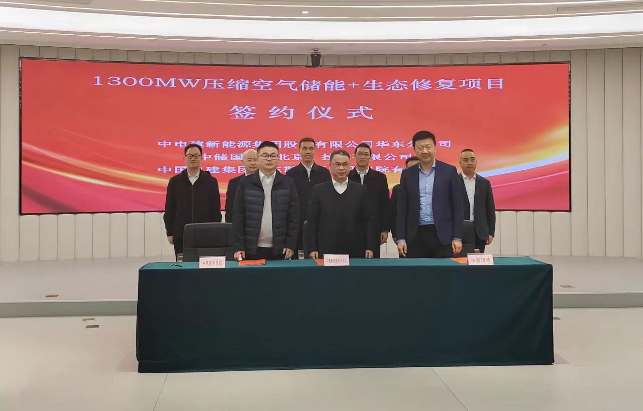 12月13日,中储国能(北京)技术有限公司与中电建新能源集团股份有限公司华东分公司、中国电建集团华东勘测设计研究院有限公司三方在浙江温州苍南县举行“1300MW压缩空气储能+生态修复”项目签约仪式。