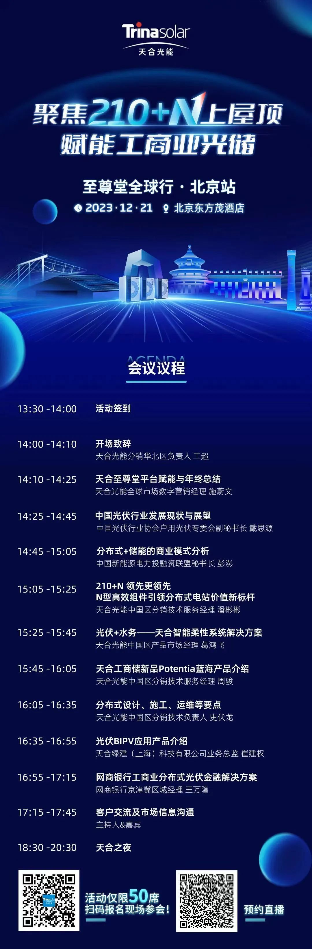未来,天合光能将持续聚焦技术创新、产品升级,通过“天合至尊堂”联动行业顶尖光储资源,建立互惠沟通桥梁,助力工商业光储产业积极发展,为全球实现零碳美好新世界贡献天合力量!12月21日,2023至尊堂收官之行·北京站,邀您莅临!