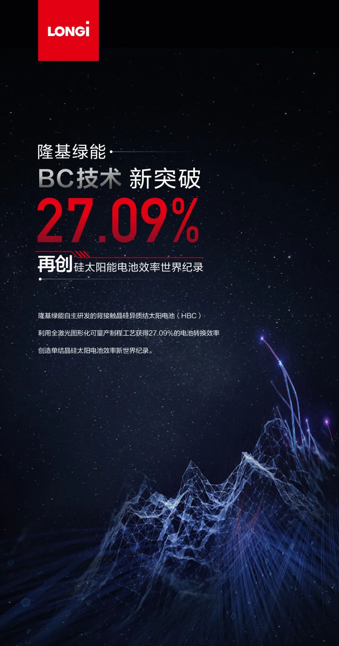 作为全球领先的太阳能科技公司,隆基绿能以创新驱动发展,以高效率、低成本、高可靠性的太阳能电池及组件产品引领全球能源变革。在以27.09%刷新硅太阳能电池效率世界纪录之前,隆基已经是晶硅单结电池和晶硅-钙钛矿叠层电池两大赛道电池效率世界纪录的“双料冠军”,并被美国国家可再生能源实验室(NREL)发布的《太阳电池最高研究效率图》、“太阳能之父”马丁·格林教授的《太阳能电池效率表》收录。