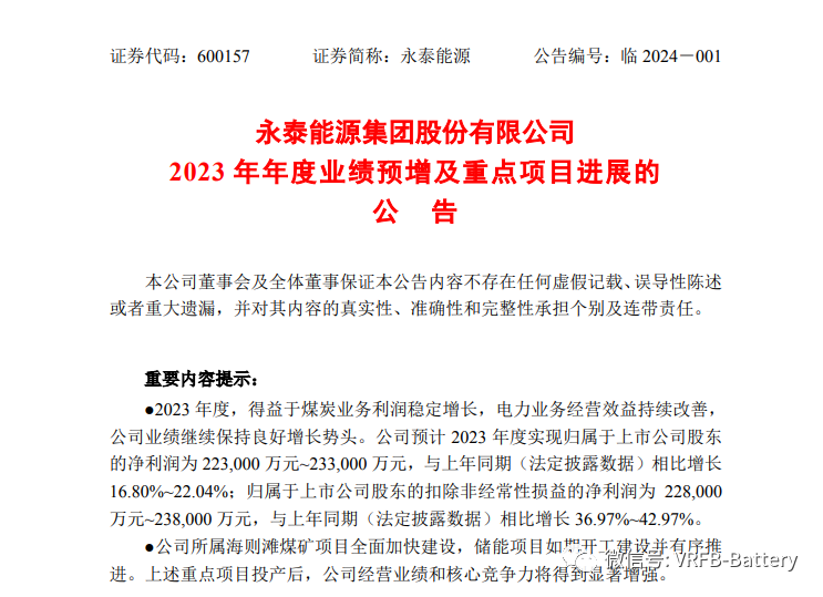2024年1月1日晚间,永泰能源发布公告称,公司预计2023年度实现归属于上市公司股东的净利润为223000万元—233000万元,与上年同期(法定披露数据)相比增长16.80%—22.04%;归属于上市公司股东的扣除非经常性损益的净利润为228000万元—238000万元,与上年同期(法定披露数据)相比增长36.97%—42.97%。