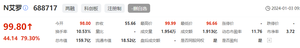 公司发行价为55.66元/股,发行市盈率为7.95倍。截至发稿,艾罗能源股价报99.80元/股,总市值达到159.7亿元!