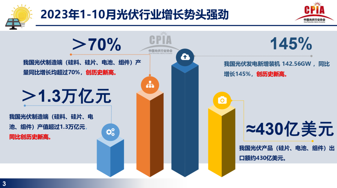在生产端,根据中国光伏行业协会统计,2023年1—10月,中国光伏行业在硅料、硅片、电池片、组件四大环节的产量同比增长速度均超过70%。产能支撑着装机量屡创新高,也加剧了市场端的激烈竞争。