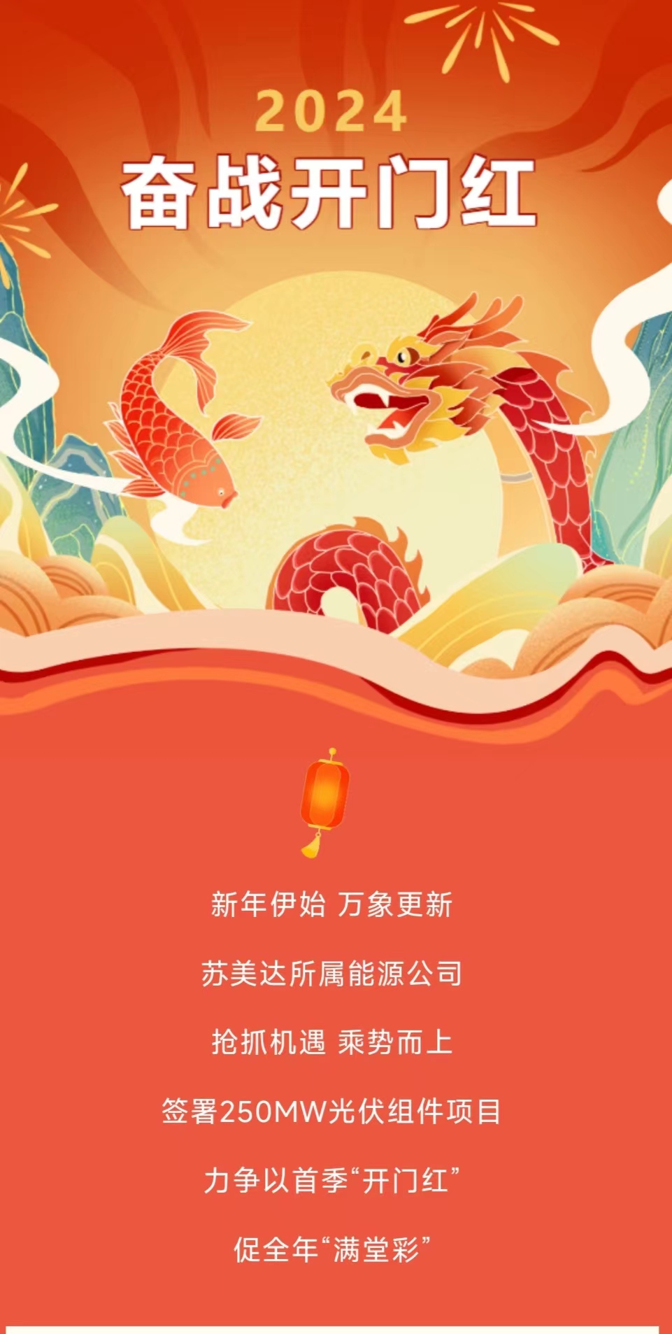 “满弦”开工,加速奔跑。面向崭新的2024年,苏美达将在国机集团的正确领导下,坚定融入“双循环”新发展格局,积极发挥专业优势,深耕清洁能源重点区域,构筑差异化竞争优势,为新型电力系统建设添砖加瓦,为国家绿色发展和双碳目标实现贡献苏美达力量。