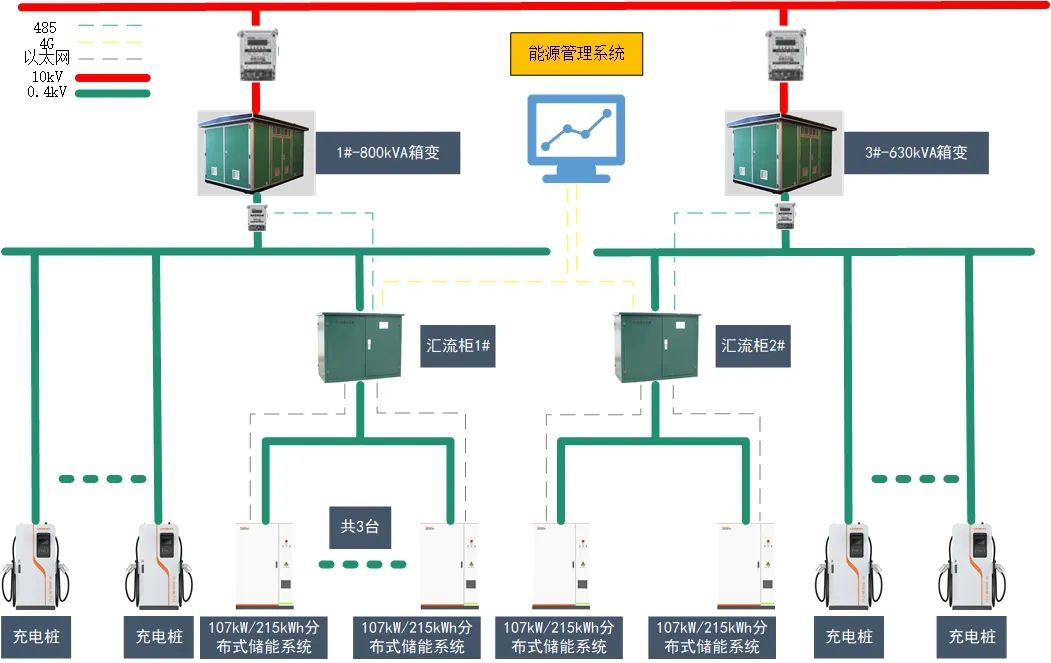 同时由于站内充电时间相对统一,EMS通过实时监测电网点关口表来获取系统内负荷运行情况,然后控制储能系统进行智能充放电,实现防逆流和需量控制,为配电系统提供功率支撑,保障系统的安全稳定运行。
