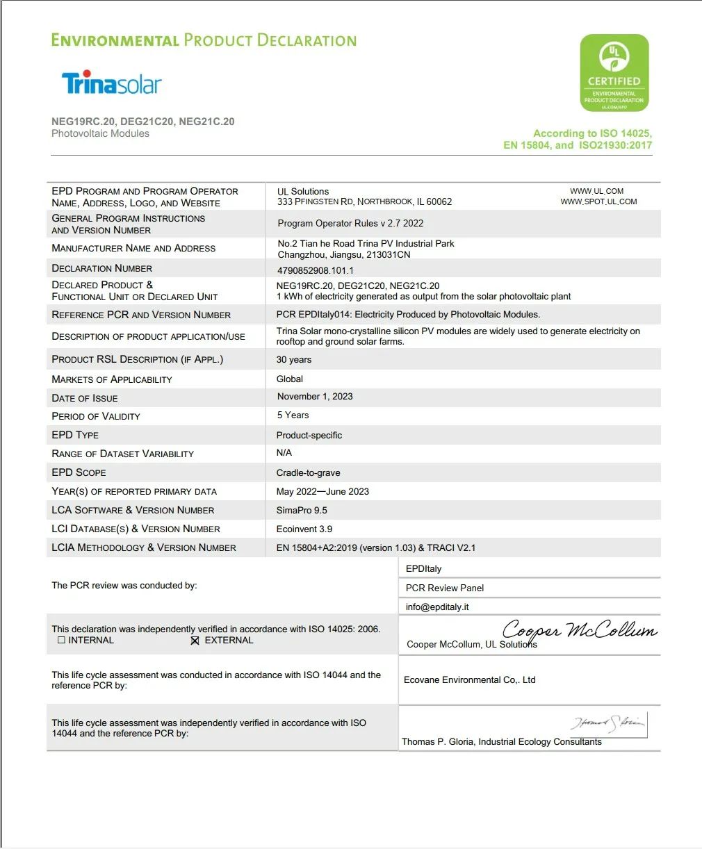 此外,就在刚刚过去不久的2023年12月,天合光能至尊N型700W、至尊N型610W和至尊670W组件顺利通过UL EPD认证并与意大利EPD互认。这其中,天合光能至尊N型700W组件温室气体影响以13.2g CO2 eq/kWh的数值领先全行业。必须强调的是,EPD是根据ISO14025标准,由产品制造商编制的综合性的、国际统一的报告。这份报告经过UL专家对数据进行全面的计算与分析,确认天合光能三款产品均符合EPD标准要求并为其编制报告及在意大利EPD系统上完成注册。据了解,本次EPD验证范围涵盖天合光能光伏组件整个生命周期环节,包括原材料获取、制造加工、运输、使用和回收等阶段。