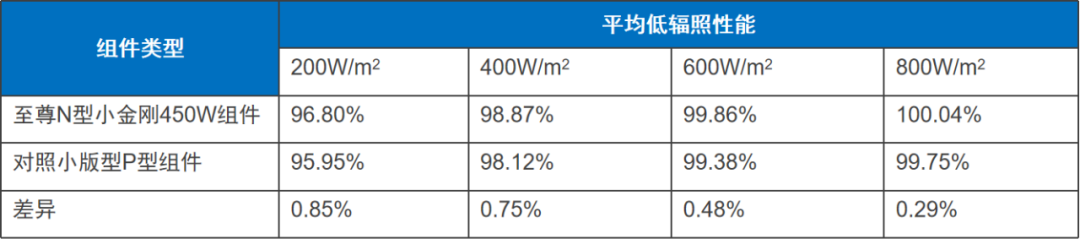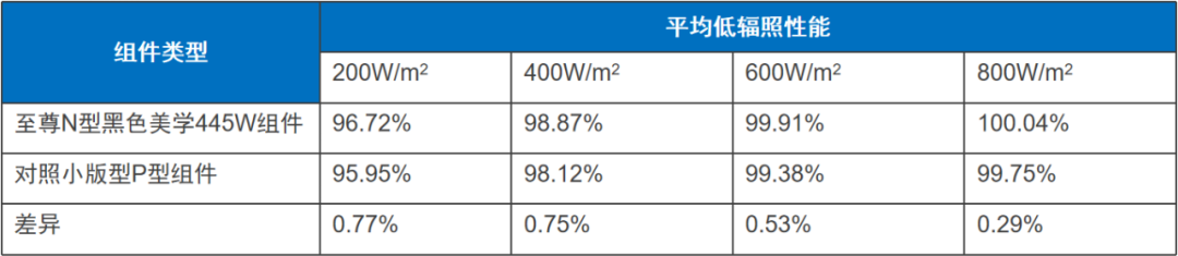 为了更好地测试至尊N型小金刚的低辐照性能,实证期间,测试组件和参考组件均参与了200W/㎡, 400W/㎡、600W/㎡和 800W/㎡测试。前三个月实证数据显示,辐照低于200W/㎡时,至尊N型小金刚450W组件和黑色美学445W组件低辐照性能较一般参考组件高出0.85%和0.77%,这就意味着至尊N型小金刚组件在低辐照环境下,单瓦发电量损失更少,这也使得至尊N型小金刚组件在欧洲和日本等低辐照市场更加具有竞争力。